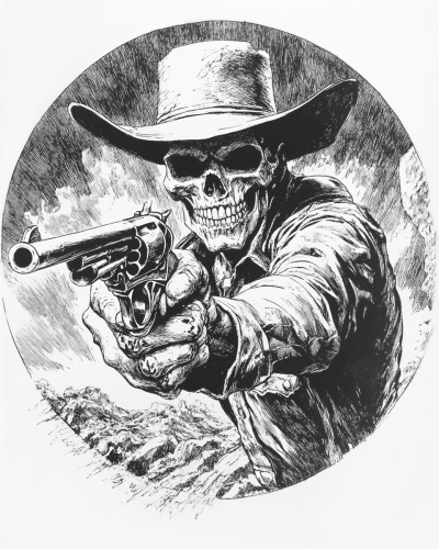 vintage round trading card of a skeleton gunslinger facing forward gun raised ready for high noon duel in the illustrative art style of virgil finlay, pencil sketch --ar 4:5