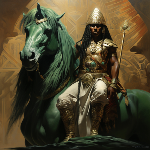 an African warrior wearing a green veiled turban and his sword in hand, sitting atop an Arabian horse in front of the Egyptian Sphinx