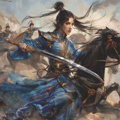 #103996 ancient China, a man on a horse. Her hair is black, long, and tied in a ponytail. He is dressed in blue and gold clothes. There is a sword in his hands. Chinese warriors are fighting around. --v 6.0 --ar 1:1