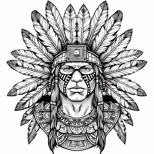 An Aztec warrior with face paint and headdress, in the style of digital art,Custom option crisp set to coloring pages, crisp lines, mandala, white background, --no shading, --v 6.0