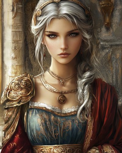 beautiful woman with grey white skin and pupilless eyes, in elaborate fine robes; style blend of ancient rome and renaissance italy; fantasy art --ar 4:5 --v 6.1