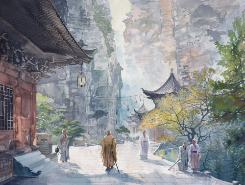 Traditional ancient Chinese landscape painting, rock color style, dreamy colors, depicting pedestrians, Buddhist temples, monks --s 50 --ar 4:3
