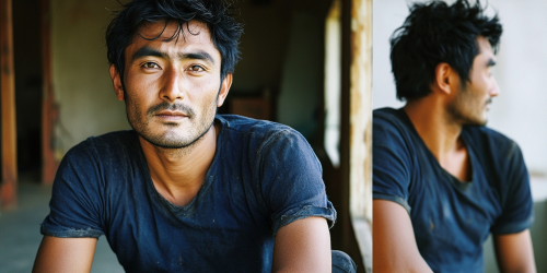 portrait photo of a nepalese man, dark black hair and brown eyes, brown skin, rough navy blue shirt slightly dirty, indoor, natural lighting, kodak portra 160, split into 2 images, shot from multiple angles --ar 2:1 --style raw