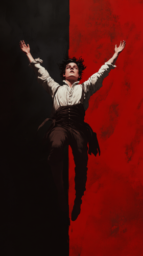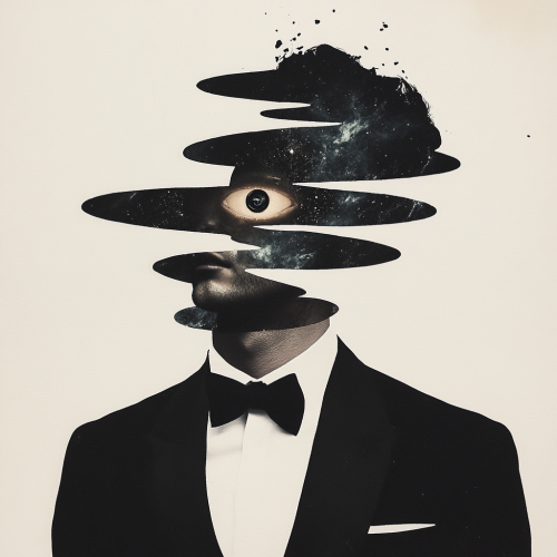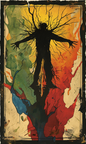 llustration, ink on paper, of a fantasy occult trading card of a silhoutte of man spliting in two in the art style of Graham Ingels, Mike Mignola, centered, psychedelic colors, vintage, --ar 3:5 --v 6.0 --s 75