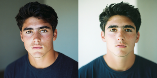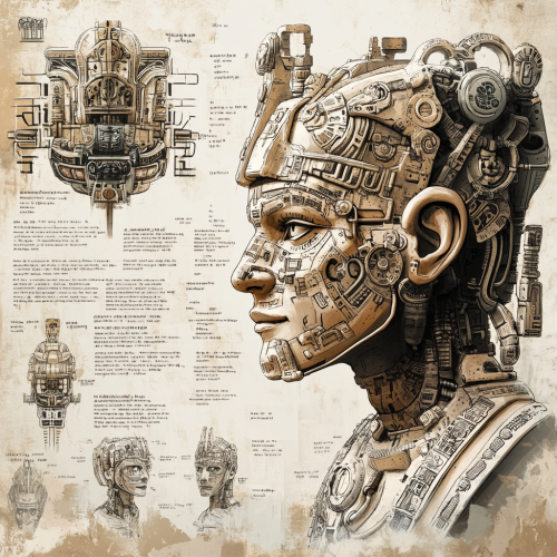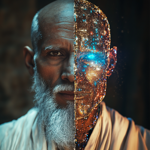 a split-image of a face of a ancient ottoman-looking man on the left, and a superhuman being, looking like a robot-ai-etherial-holographic-cyborg on the other half of the split-image, frontal portrait, symmetric face features, realistic photograph,shot on Sony A7RV, shot with a 50mm Sony 1.4 GM lens, dramatic lighting --v 6.1