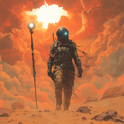 The album cover depicts the cyborg trekking across a vast desert landscape under a midday, cracked sky. In its hand, it carries a long, staff-like device topped with the same glowing orb seen in the first cover. Sand swirls around, driven by winds that seem to slice through the air with an almost tangible force. The colors are warm oranges and deep rusts, reflecting the harsh environment. The cyborg's expression is one of determination and focus, emphasizing its mission. --s 250