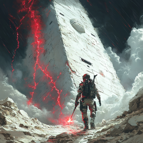 This cover features the cyborg trekking through a rugged terrain scattered with white rocks and black soil, under a sky swirling with dark clouds pierced by red lightning. Clutching the red crystal, now more luminous, the cyborg approaches a monolithic structure made of white stone with red and black markings, hinting at ancient technology --s 250