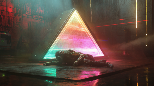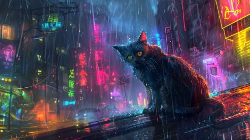 pintura para cuadro de un paisaje cyberpunk acojedor, con lluvia y luces de neon, con un gato cyborg como personaje principal en la imagen --ar 16:9