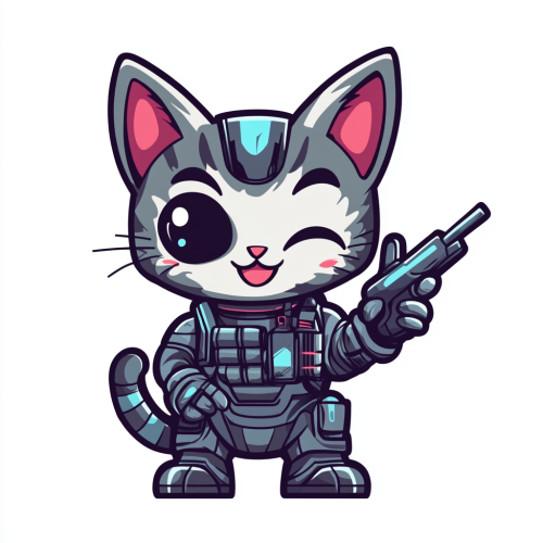 futuristic minimalistic mercenary company logo of a cute cyborg kitten with a mischevious expression holding a ray gun winking and giving the peace sign