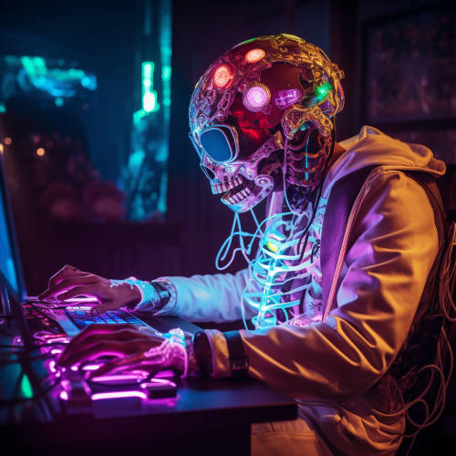 man djing at a desk wearing a glowing light up LED cyborg Skelton mask