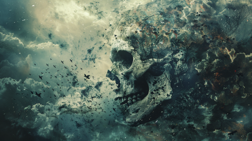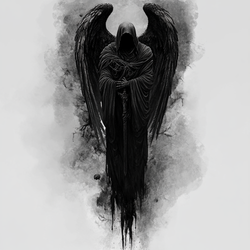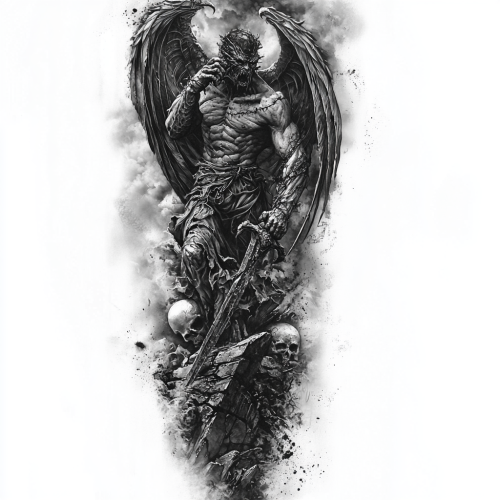 Create a highly detailed, realistic arm sleeve tattoo design featuring the Angel of Death as the central figure. Depict him as a powerful, ominous male figure with large, dark, tattered wings. His face should be calm yet haunting, with hollow eyes or a subtle, stoic expression that conveys both mystery and inevitability. He should be robed in dark, flowing garments, holding a large scythe or a sword, symbolizing his role as a guide to the afterlife. Surround him with swirling shadows and mist, blending into a background of crumbling ruins or withered trees to enhance the dark, eerie atmosphere. Add subtle ancient Greek motifs like skulls or laurel wreaths, symbolizing death and passage, while rays of light pierce through the darkness to signify the transition between life and death.