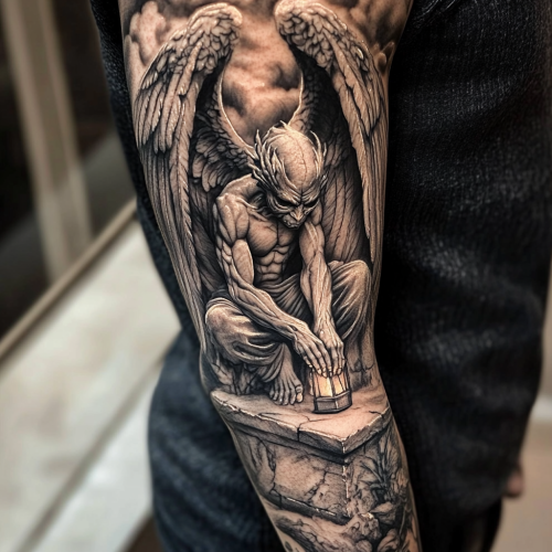 Create a highly detailed, realistic arm sleeve tattoo design featuring an intense scene between a gargoyle and the Angel of Death. The gargoyle, perched on a jagged stone ledge, should be depicted with sharp, menacing features, wings partially spread, as if ready to pounce or defend. Opposite the gargoyle, the Angel of Death stands tall and commanding, with dark, tattered wings, holding a scythe or sword, exuding a calm yet ominous presence. His face should be shadowed, with hollow or piercing eyes, symbolizing death’s inevitability. Surround the scene with a dramatic backdrop of swirling mist, crumbling ruins, and stormy skies, giving a sense of tension between the two powerful figures. Incorporate subtle symbols of death and protection, such as skulls, ancient stonework, and faint rays of light piercing through the darkness, adding depth to the design while emphasizing the contrast between the guardian gargoyle and the bringer of death.