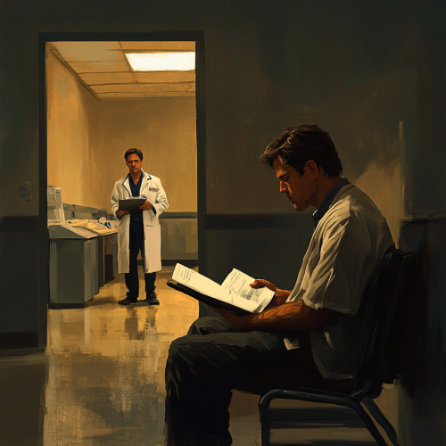 Create an image depicting a tense hospital scene, where a distraught husband is seated in a cold, sterile waiting room, visibly anguished after receiving news of a loved one's death due to medical malpractice. The doctor, looking regretful, stands in the background holding medical records. The environment reflects the gravity of the situation, with dim lighting emphasizing the emotional weight. The scene should convey sorrow, confusion, and the feeling of a devastating loss. Photorealistic style with detailed expressions on the characters’ faces, capturing the essence of grief and regret --ar 1:1 --v 6.1