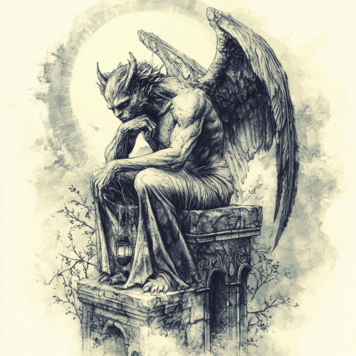 Create a highly detailed, realistic arm sleeve tattoo design featuring a guardian gargoyle and the Angel of Death in a more serene and symbolic scene. The gargoyle, sitting calmly on a stone ledge, should have soft, protective features, with its wings folded gently as it watches over the scene below. Opposite the gargoyle, the Angel of Death stands with large, dark wings, but instead of a fearsome expression, he exudes a peaceful, guiding presence. He holds a lantern or staff, symbolizing the light of transition rather than a scythe. Surround them with a tranquil backdrop of ancient stonework, soft clouds, and a fading sunset, casting a warm glow over the scene. Incorporate gentle symbols like olive branches, faint rays of light, or soft flowing vines, emphasizing the themes of protection, guidance, and the natural passage of life, creating a harmonious balance between the two figures.