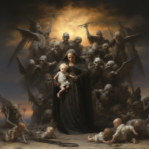 The angel of death taking the souls of little children to Purgatory, Gustave Dore style in color