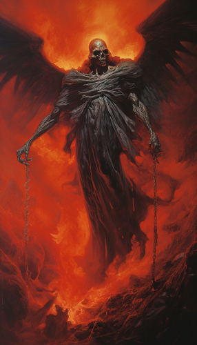 The powerful angel of death charging into hell, dark retro fantasy, d& d, johfra bosschart, golden age illustrations, mort künstler, trompe - l'œil illusionistic detail, Wayne Barlowe --ar 73:128