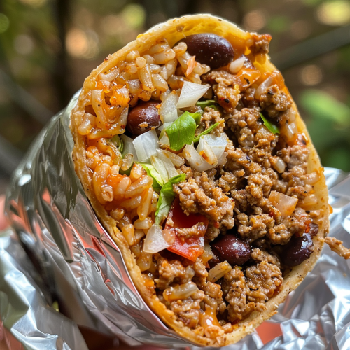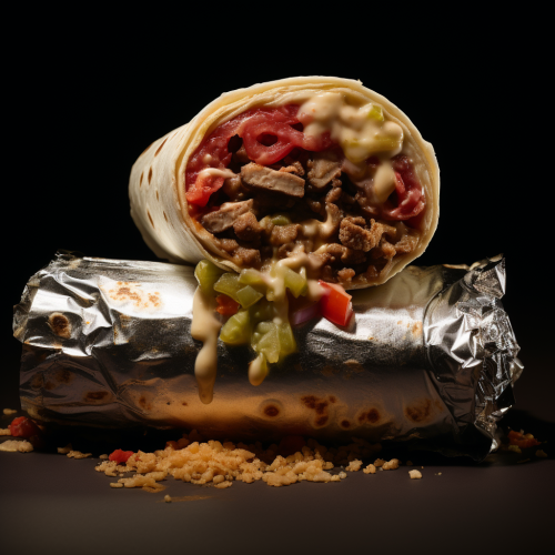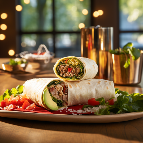 Create a festive and appetizing image set in bright daylight. The scene should feature a wooden table with a real-life photo-like quality. On the table, place a delicious-looking burrito in a vibrant and colorful wrapping. Next to the burrito, position a gift card with a prominent 'FREE' stamp displayed prominently on it. The lighting should highlight the textures and details of both the burrito and the gift card. The overall image should evoke a sense of celebration and excitement, making the viewer eager to claim their free burrito using the gift card.