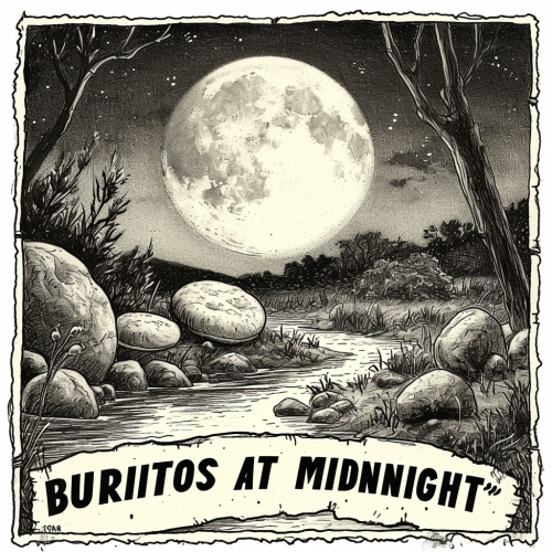 round logo showing a burrito and a moon and the text "BURRITOS AT MIDNIGHT" style of Robert crumb --v 6.0 --s 750