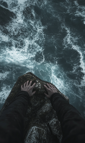someone holding on to the edge of a cliff, they are looking up at the camera which is above them, above choppy sea water, they are scared, stormy spooky dark weather, hyper realistic, ultra realistic, photoreal, 4k, 8k, --ar 3:5