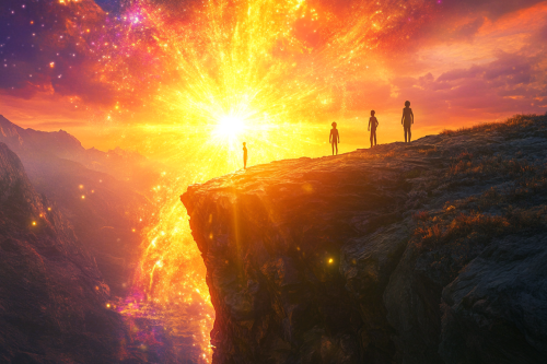 3d CGI animated close up image of Children standing on a cliff's edge, watching a glowing river of light flowing from the heavens into their radiant bodies, very detailed, bright colors, childrens book image, cinematic lighting, --ar 3:2