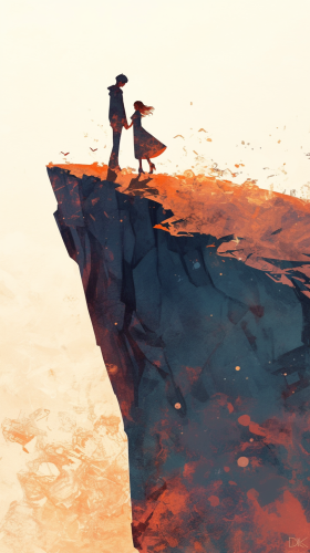 A picture using a watercolor style. Light color. A couple standing at the edge of a cliff, holding hands as they prepare to jump into the ocean below. The sea is calm, symbolizing that they are escaping the wreckage of their relationship together. --ar 9:16 --niji 6