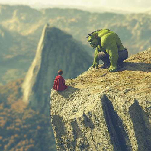 green orc child saving the life of an intelligent and clumsy young human on the edge of a cliff, pixar theme, 3d, render, 3d pixar, funny texture, beautiful colors, hue saturation, many colors, funny scene, zoom face