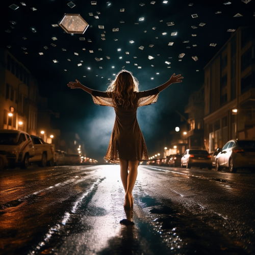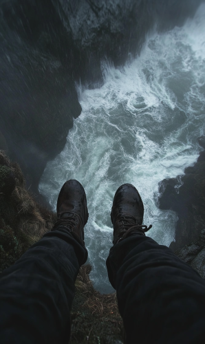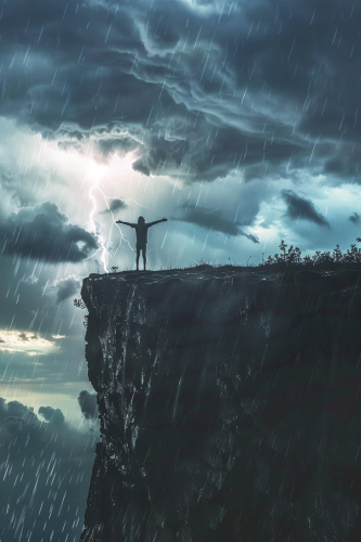 Silhouette in the rainstorm: A person standing at the edge of a cliff, arms wide open, embracing the rain pouring from ominous storm clouds. Lightning flashes in the distance, but the figure remains calm and peaceful, grounded in the moment, symbolizing resilience amidst chaos. --v 6.0 --ar 2:3