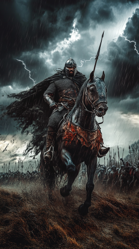 Attila the Hun riding at the front of his vast horde, stormy skies overhead, with dark, ominous clouds and thunder striking in the distance, surreal, hyper-realistic, Ultra HD --ar 9:16
