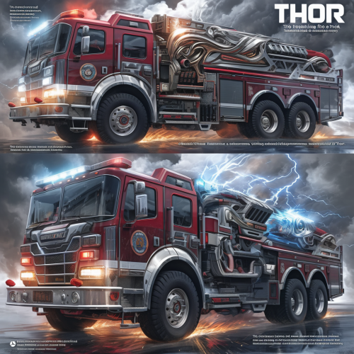 "An awe-inspiring fire truck completely transformed with the design and essence of Thor. The truck features a striking silver, dark blue, and red color scheme, with metallic plating that mimics Thor’s Asgardian armor. The front of the truck prominently displays a massive, glowing Mjolnir hammer emblem, radiating powerful lightning energy. The headlights emit a bright, electric blue glow, symbolizing Thor’s control over lightning and thunder. Along the body of the truck, Asgardian runes and intricate designs are etched into the metal, giving it a mystical, ancient feel. The truck’s wheels are massive, with glowing lightning bolts spinning around the rims, as if charged with Thor’s divine power. The truck’s body is heavily reinforced, with an almost indestructible, battle-hardened look, reminiscent of Thor’s durability in combat. The scene is set in a stormy landscape, with dark clouds swirling overhead and flashes of lightning illuminating the truck, which pulses with a faint, rhythmic blue aura, representing the divine power of the God of Thunder." --s 750 --style raw --niji 6