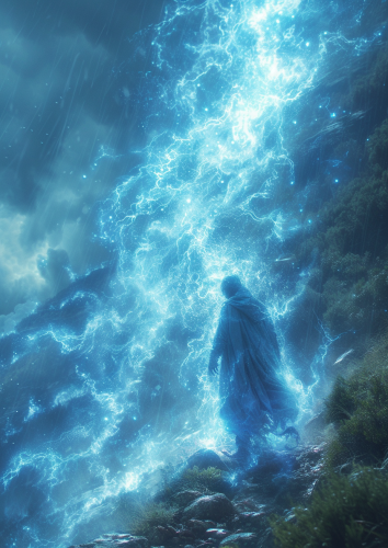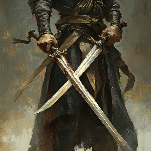 A man carried a sword in each hand, both slightly curved near the tip. The crossguards on each of the blades were straight across, signifying that the blade was that of fine work. The man could cross his swords and scrape them against one another, making each blade take on a faint reddish hue. The blades could then electrify the air around the man, allowing the man to strike lightning quick and if the swords were banged against each other, a sound akin to thunder would be produced.