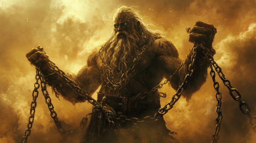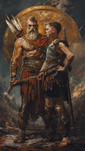 god of war holding his fighting tools and his son Aterus --ar 9:16 --v 6.0
