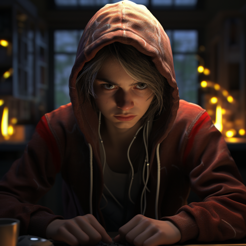 Angry androgynous girl with hoodie, sad, angry, computer monitor lighting, hyper realism, 8k resolution
