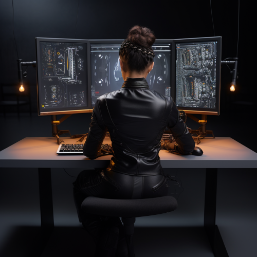 back view, American Sign Language interpreter, at a computer workstation, black professional outfit, videogame character, ue5, oc rendering, thunder lighting, hyper-realistic, 8k --v 5.2 --style raw