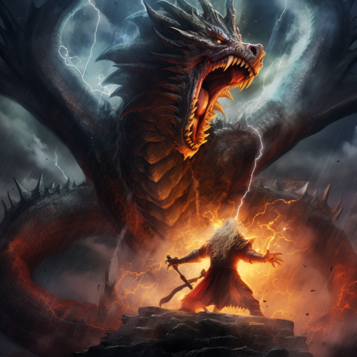 the god chaos striking down a thunder bolt on a dragon ( make the image be inspired by christian icons)