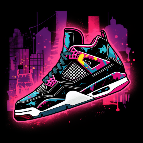 "Iconic silhouette of the Jordan 4 Thunder, graffiti art-inspired, vibrant and energetic, neon lighting style, T-shirt design graphic, vector, contour, white background."