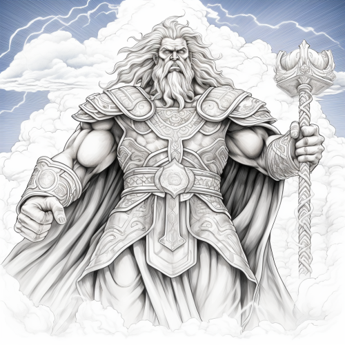 Title: "Majestic Zeus" Description: This black and white adult coloring book page features the mighty Greek god Zeus, the supreme ruler of Mount Olympus and the god of the sky, lightning, and thunder. Standing tall and regal, Zeus exudes an air of authority and strength. His well-defined physique is adorned with the classical drapery of ancient Greece, adding a touch of grandeur to his appearance. Physical Features: Zeus' face is chiseled, with a strong jawline and a beard that flows gracefully. His eyes, portraying wisdom and power, are framed by a crown of laurel leaves, symbolizing victory. The artist has captured the essence of Zeus' flowing hair and beard, which are reminiscent of thunderclouds in their intricate patterns. Primary Power: In one hand, Zeus wields his iconic thunderbolt, crackling with energy and ready to unleash the might of a storm. The other hand is raised in a commanding gesture, showcasing his divine authority. The sparks of lightning emanate from the thunderbolt, creating dynamic lines for colorists to bring to life with shades of grey. Attractive Aura: Despite his imposing stature, Zeus carries an attractive aura, enhanced by a subtle and confident smile. The coloring page provides an opportunity to emphasize the contrast between his godly strength and a certain charm that has often captivated both mortals and immortals alike. Surroundings: The background of the coloring page showcases the celestial realm of Mount Olympus, with clouds swirling around the god of thunder. Majestic pillars rise in the distance, suggesting the grandeur of his divine abode. Other gods and goddesses, perhaps faintly outlined, pay homage to Zeus, acknowledging his supreme status in the pantheon. This detailed adult coloring book page invites enthusiasts to [...]