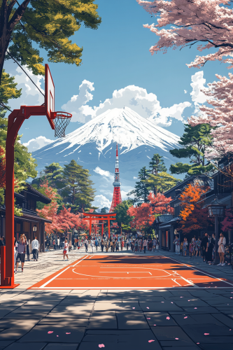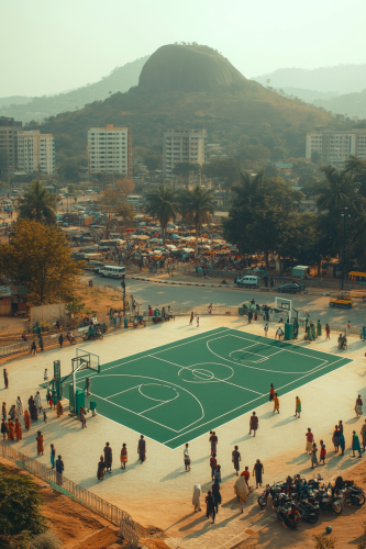 A highly realistic wide-angle scene set in Abuja, Nigeria, featuring a small half-court NBA-style basketball court in the foreground with a detailed basketball net. The court is outlined with sharp green and white lines, symbolizing the Nigerian flag. Locals are dressed in vibrant traditional Yoruba Agbada, Igbo Isiagu, and Hausa Babanriga clothing, engaging in cultural activities near the court and around a bustling marketplace. In the background, the towering Aso Rock is depicted with realistic textures, rising above the scene and blending the natural beauty with the urban environment. To the left, a famous roundabout, such as the Unity Fountain Roundabout, is visible, with cars, motorcycles, and colorful vehicles moving through the busy streets, adding movement and vibrancy. Modern residential buildings and apartment complexes rise into the skyline, showcasing Abuja’s urban development. The midday sunlight casts warm, natural shadows across the basketball court, vehicles, and people, enhancing the sharpness and depth of every element. The minimalist realism style ensures that each cultural, natural, and modern detail is clearly defined, creating a lively yet harmonious representation of Abuja. --ar 2:3 --s 250 --v 6.1