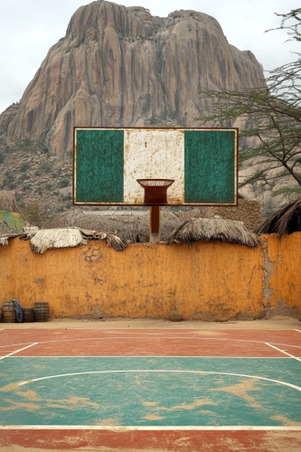 Centered wide-angle view of a realistic half-court basketball scene with a Nigerian flag as the backboard, no markings or logos. The basketball court is the color of the Nigerian flag, with the ground reflecting the natural terrain people walk on in Nigeria. In the background, Chappal Waddi rock looms majestically. Nigerian cultural elements are clearly visible: traditional clay huts with thatched roofs, bustling marketplaces, and locals dressed in vibrant agbada, gele, and buba. Baobab and iroko trees line the scene, along with talking drums and masquerade masks. Street vendors sell jollof rice and suya, capturing the lively spirit of Nigeria --ar 2:3 --s 250 --v 6.1