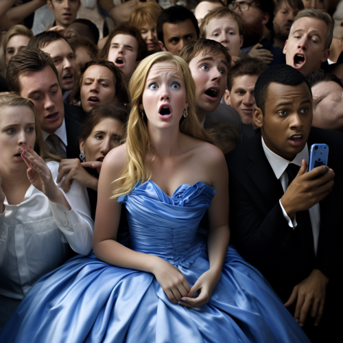 a realistic image of a crowd of people standing together, one person stands above the rest with their hand raised. dramatic navy and cyan lighting. --ar 16:9