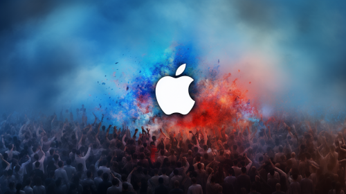 Apple logo, gradient from red to blue, artistically rendered, floating in front of thousands of angry people --ar 16:9