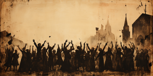 silhouette of medieval crowd, people cheering, 1500s, semi realistic, --ar 2:1