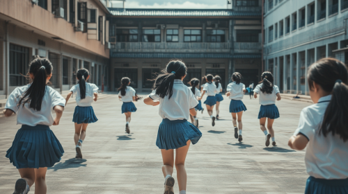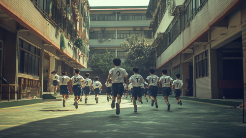 Background of a courtyard in a Taiwanese high school campus. A close-up of several students, both male and female, in school uniforms, running and playing, seen from behind. The atmosphere is joyful and lively, capturing the carefree spirit of youth, with high detail and historical accuracy ,photograph --ar 16:9