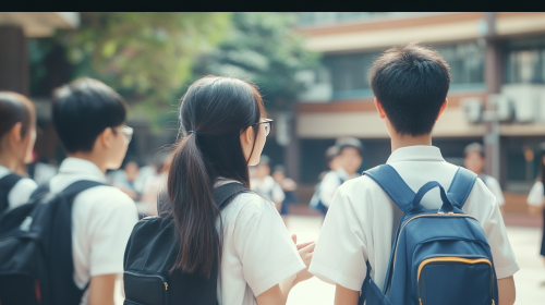 Background of a Taiwanese high school courtyard. A close-up of several students, both male and female, in school uniforms, chatting together, seen from behind. The atmosphere is joyful and lively, with other students playing in the courtyard in the background, adding to the cheerful ambiance, with high detail and historical accuracy ,photograph --ar 16:9