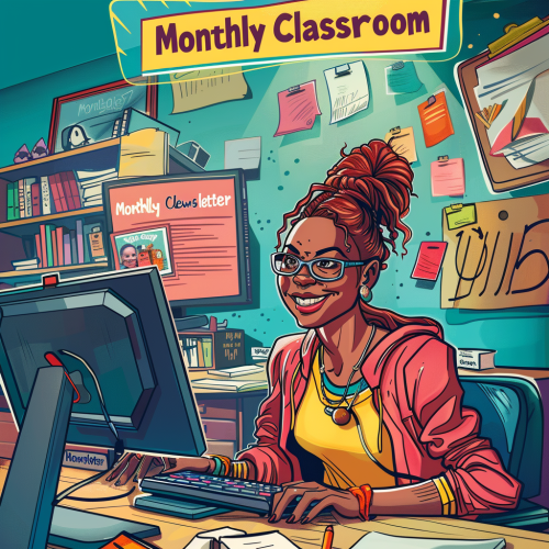 A vibrant comic-style illustration of a teacher happily designing a "Monthly Classroom Newsletter" on a computer, with highlights of student achievements and future events surrounding them. The atmosphere is positive and community-focused. No text in the image,Bold, clear lines, bright colors, modern comic style --v 6.0