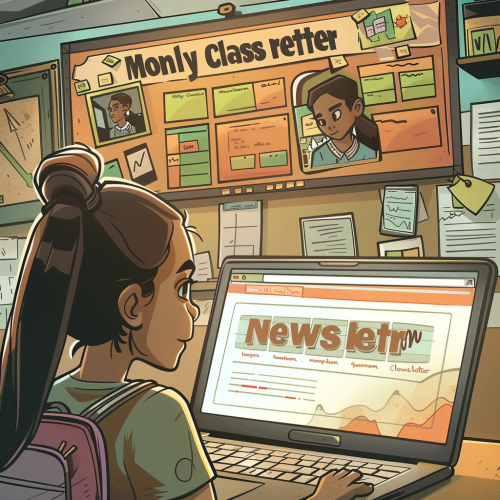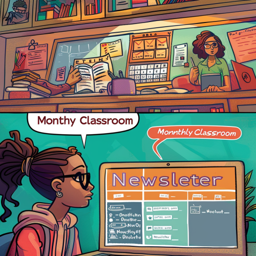 A comic panel depicting a teacher creating a "Monthly Classroom Newsletter" on a laptop. The scene shows snippets of student achievements, upcoming events, and parent tips displayed on the screen. The background includes a bulletin board with various highlights.No text. Warm colors, modern comic style --v 6.0