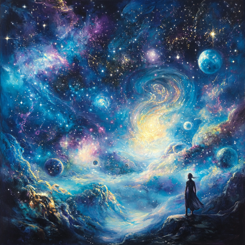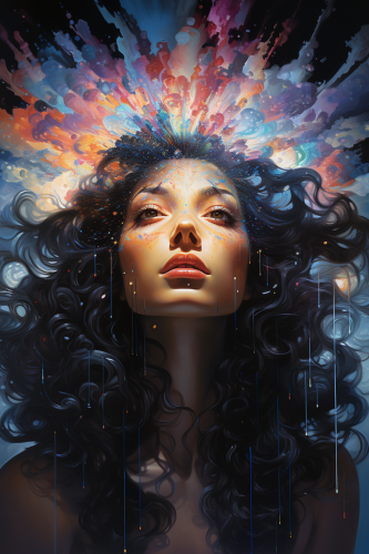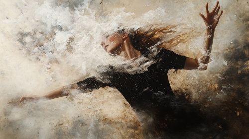 Graceful Dance, Ephemerality in the form of a portrait of a woman disintegrating into cosmic nebulae, full body portrait by Bill Durgan and Rankin and John Batho, Hubble Telescope image, deterioration, oil painting, temporality, transience, fleeting, evanescent, ominous, wistful, deflating, dreamy, Fuji Polaroid film combined with oil painting, surreal, cinematic and dramatic and mysterious --ar 16:9