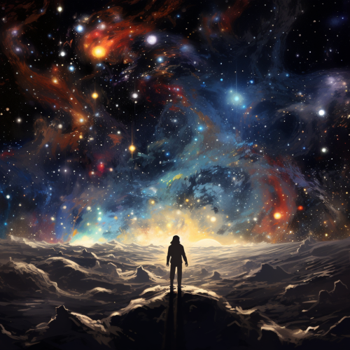 Anime-style warriors in cosmic battle among vibrant nebulae, celestial patterns, glowing constellations.