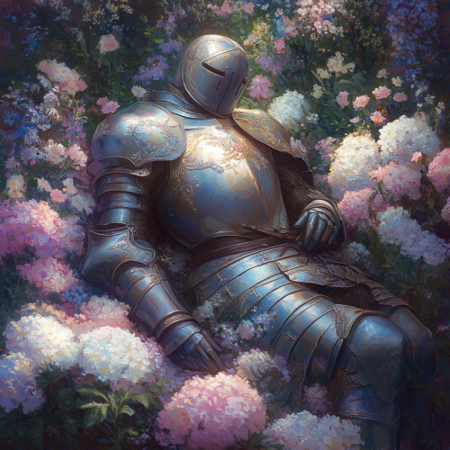 A serene knight in shining, intricately detailed armor, resting peacefully on a bed of vibrant, delicate flowers. The knight is depicted in a dreamlike, ethereal setting, with a soft glow reflecting off the polished metal of the armor. The flowers around him are lush and blooming in a variety of pastel colors--pink, purple, white, and blue. The style is reminiscent of classical European art with a touch of fantasy, focusing on the calm and peaceful expression of the knight. Soft, natural lighting, high detail, and a painterly quality