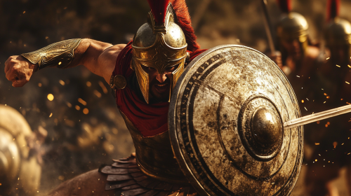A Greek hoplite catching an enemy’s sword with his shield, countering with a swift spear thrust, intense focus Hyper Realistic HD photos --v 6.1 --ar 16:9