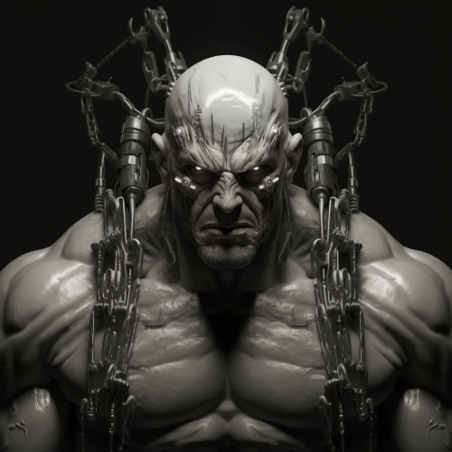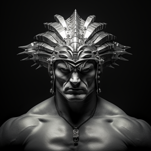 bodybuilder muscles, metal pipe head dress, metal pipe headdress, soft lighting, geiger, a bald man, realistic, a huge muscled man, rage, anger, muscly, black and white, man, muscles, armor, geiger, realistic